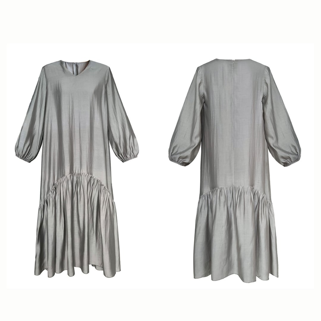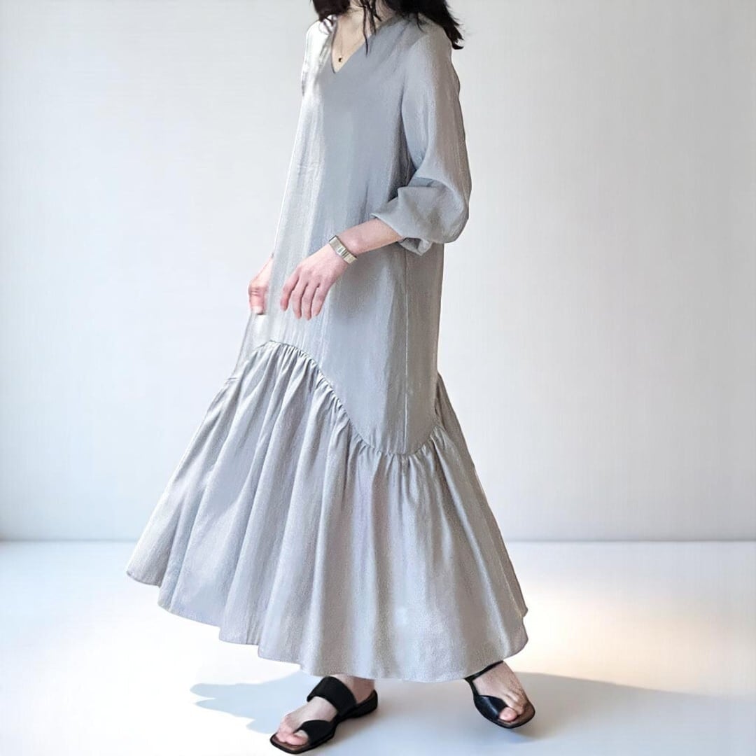 上品なシルエットと軽やかな着心地が魅力のVネック フィッシュテール ワンピース。しなやかで柔らかいテンセル生地を使用し、肌触りがよく、動くたびに美しく揺れるシルエットが特徴です。