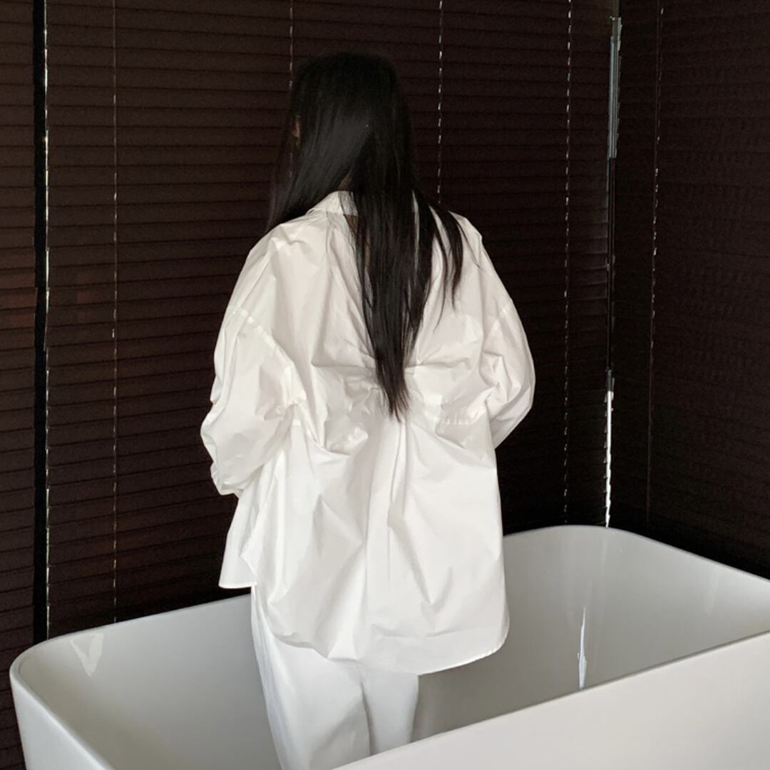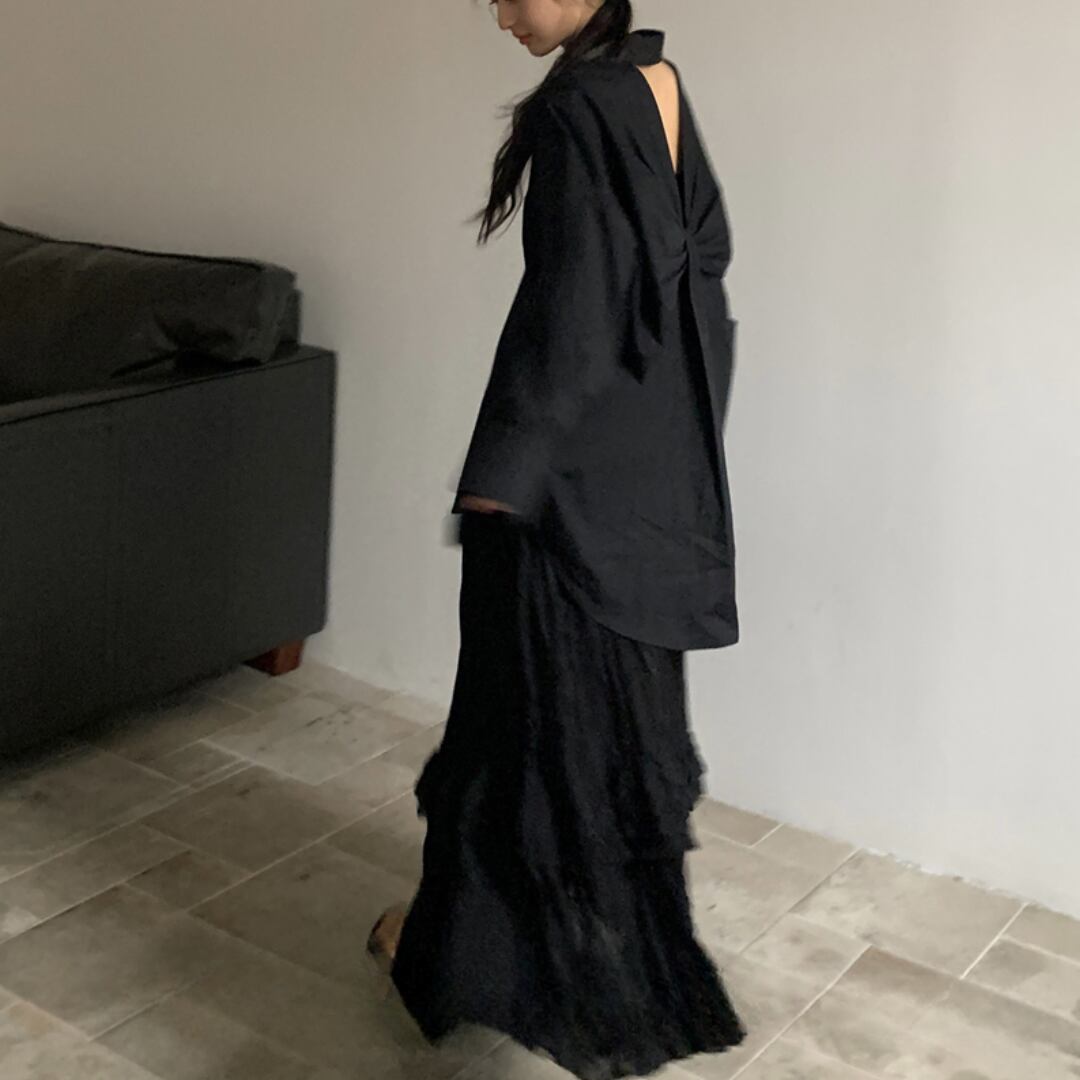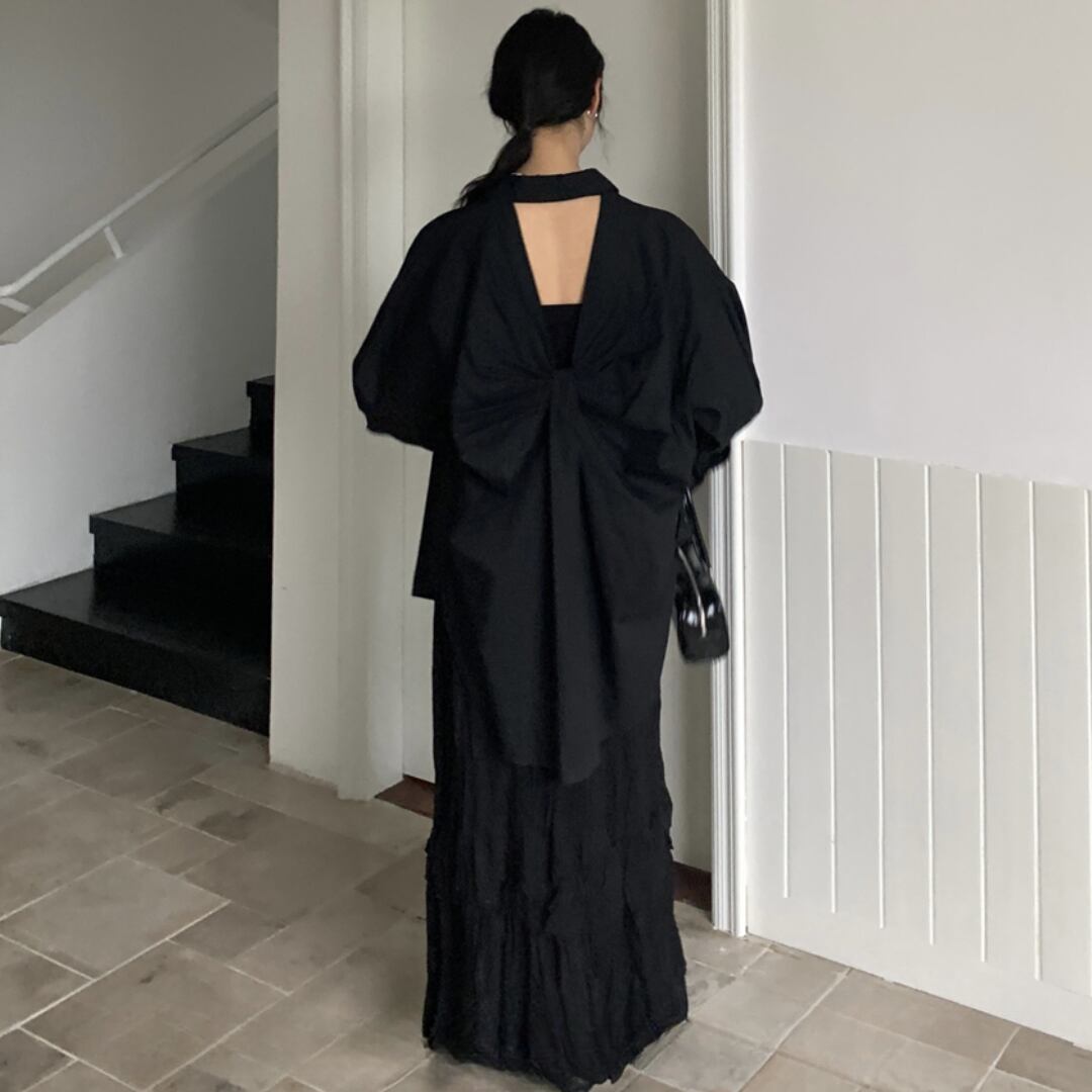 バックオープンデザインシャツが、大人の抜け感を演出する一枚。