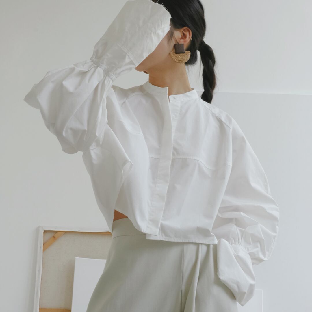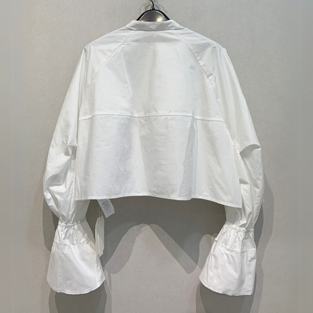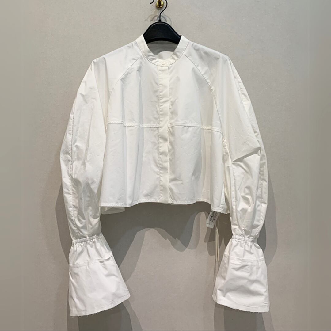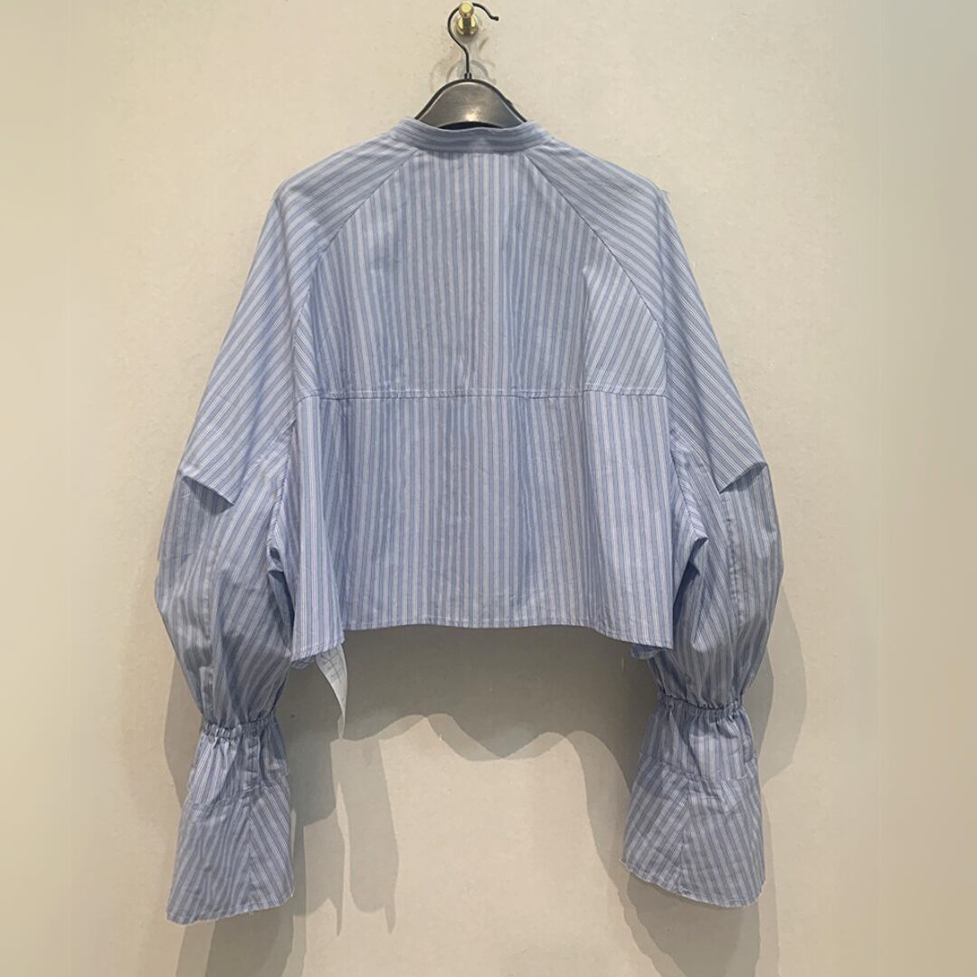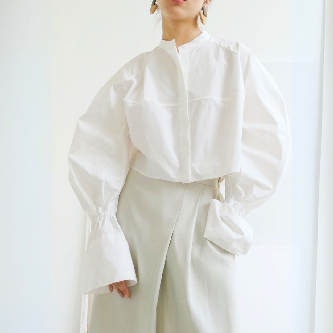 トレンド感あふれるベルスリーブデザインが特徴のショート丈シャツ。