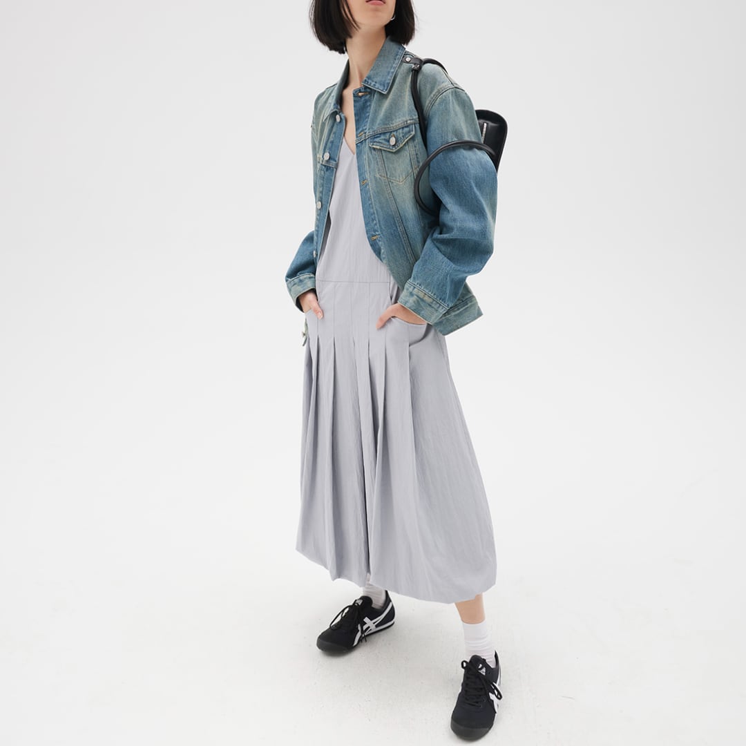 シンプルながらも存在感のあるVネックバルーンワンピース。