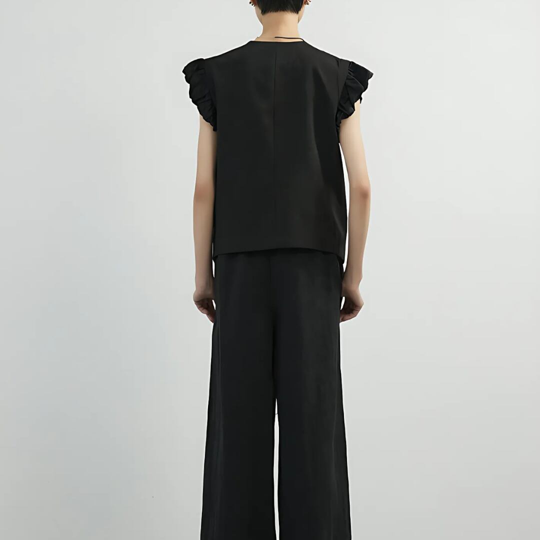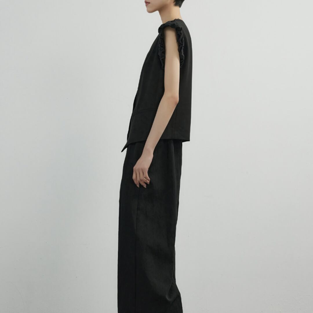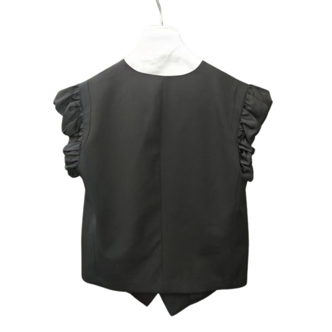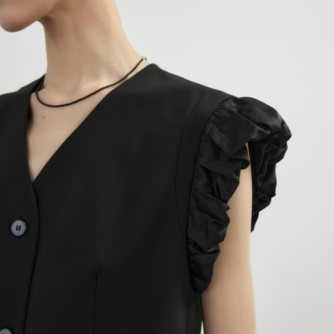 フェミニンさとスタイリッシュさを兼ね備えた一枚。シックなブラックカラーが上品な印象を与えつつ、フリルデザインの袖が華やかさをプラスします。