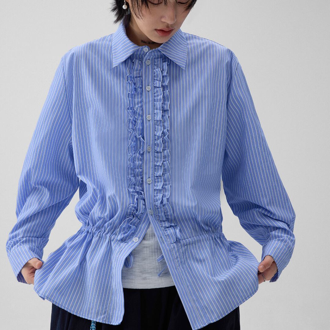 爽やかなブルーカラーが魅力のフリルシャツです。ウエストが絞れるデザインになっており、シルエットにメリハリをつけて女性らしいスタイルを演出します。