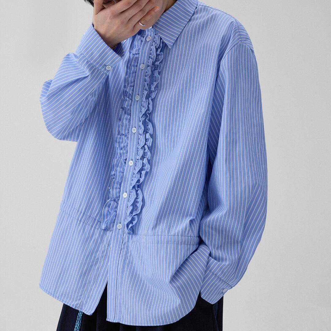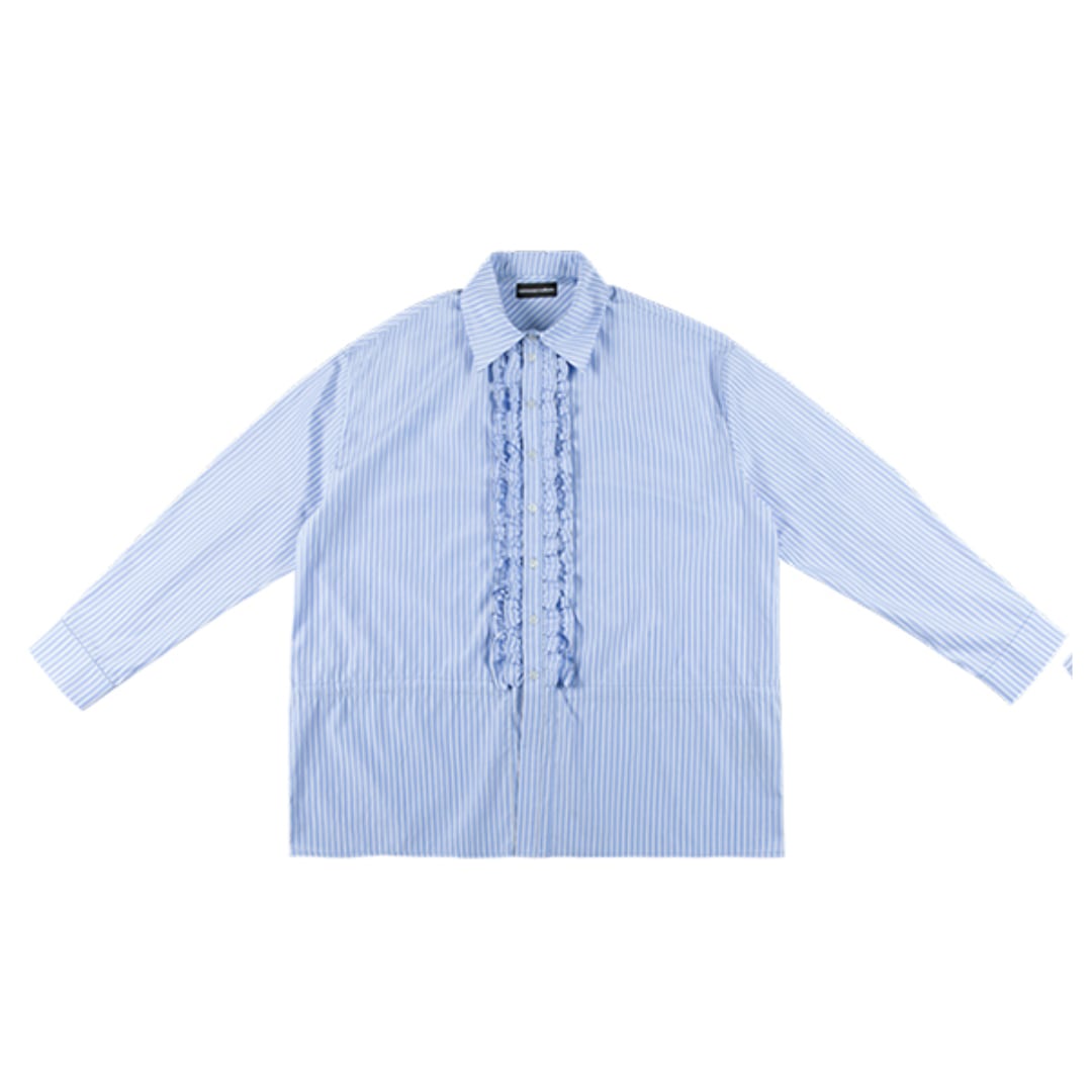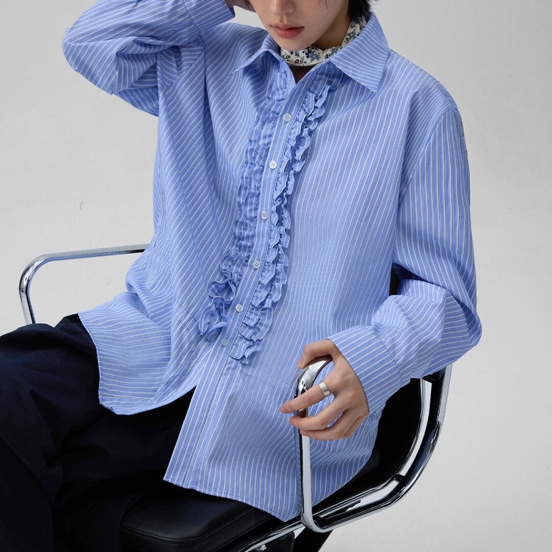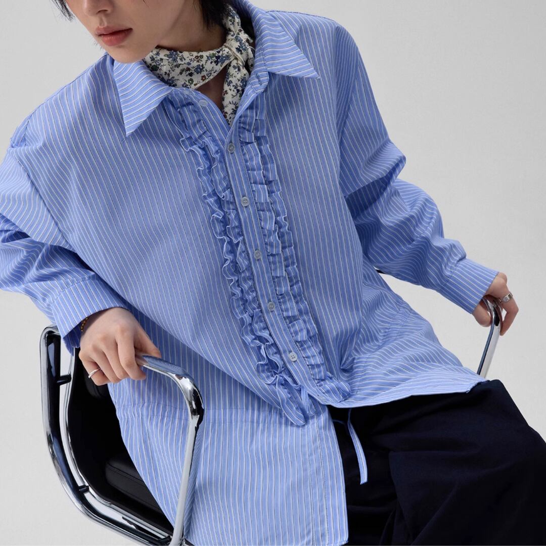 フリルのディテールが華やかさをプラスしながらも、シンプルなデザインとクールなブルーカラーがバランスよく調和。甘すぎず、程よいフェミニンさとシャープな印象を両立させた一枚です。