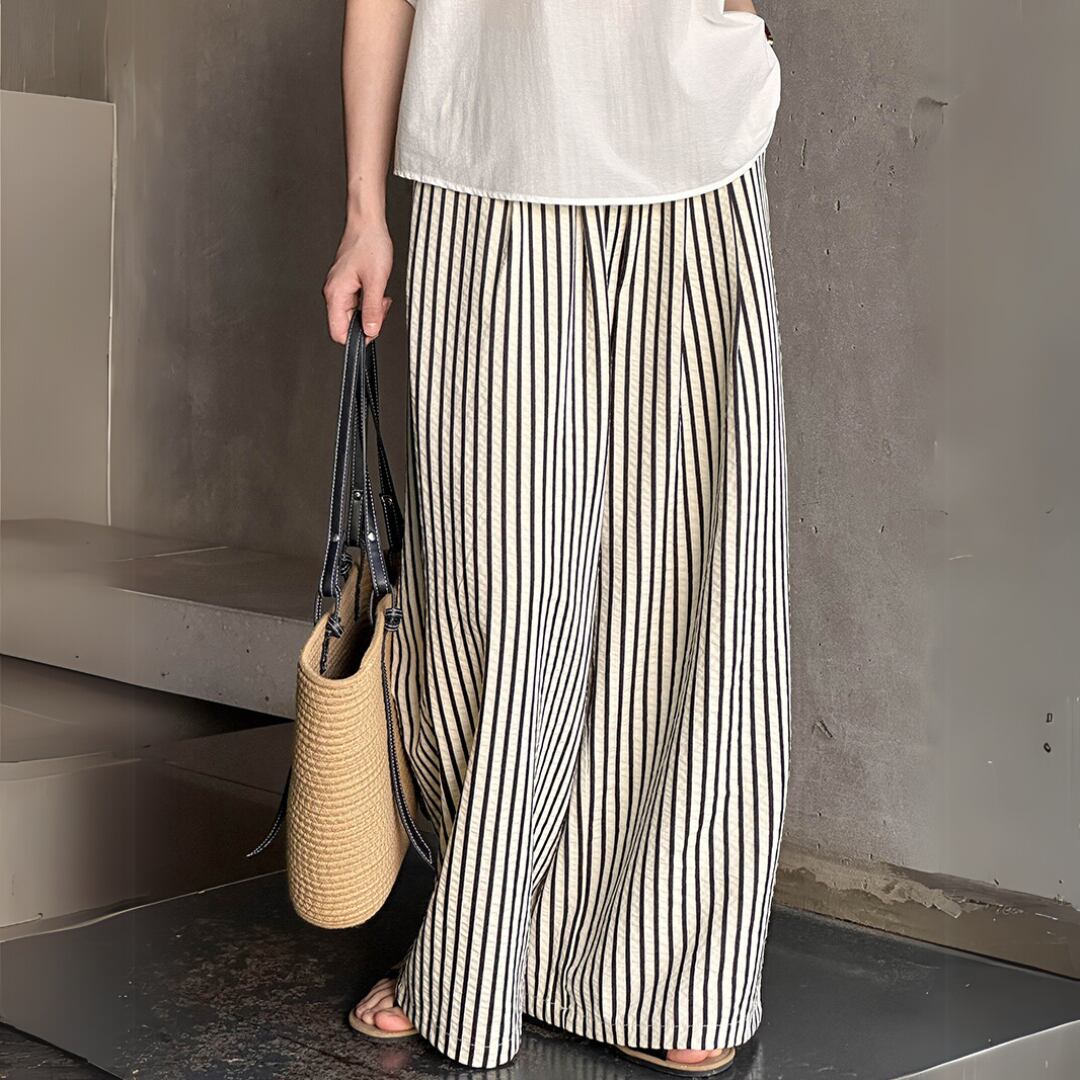 ウエスト部分はゴム仕様で、快適なフィット感を実現。ストライプ柄が縦のラインを強調し、スタイルアップ効果も期待できます。