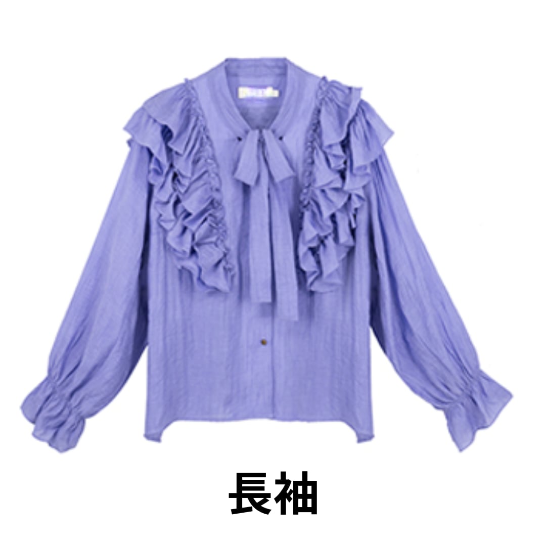 深みのあるパープルブルーが魅力の上品さとさりげない女性らしさを兼ね備えたボウタイブラウスです。