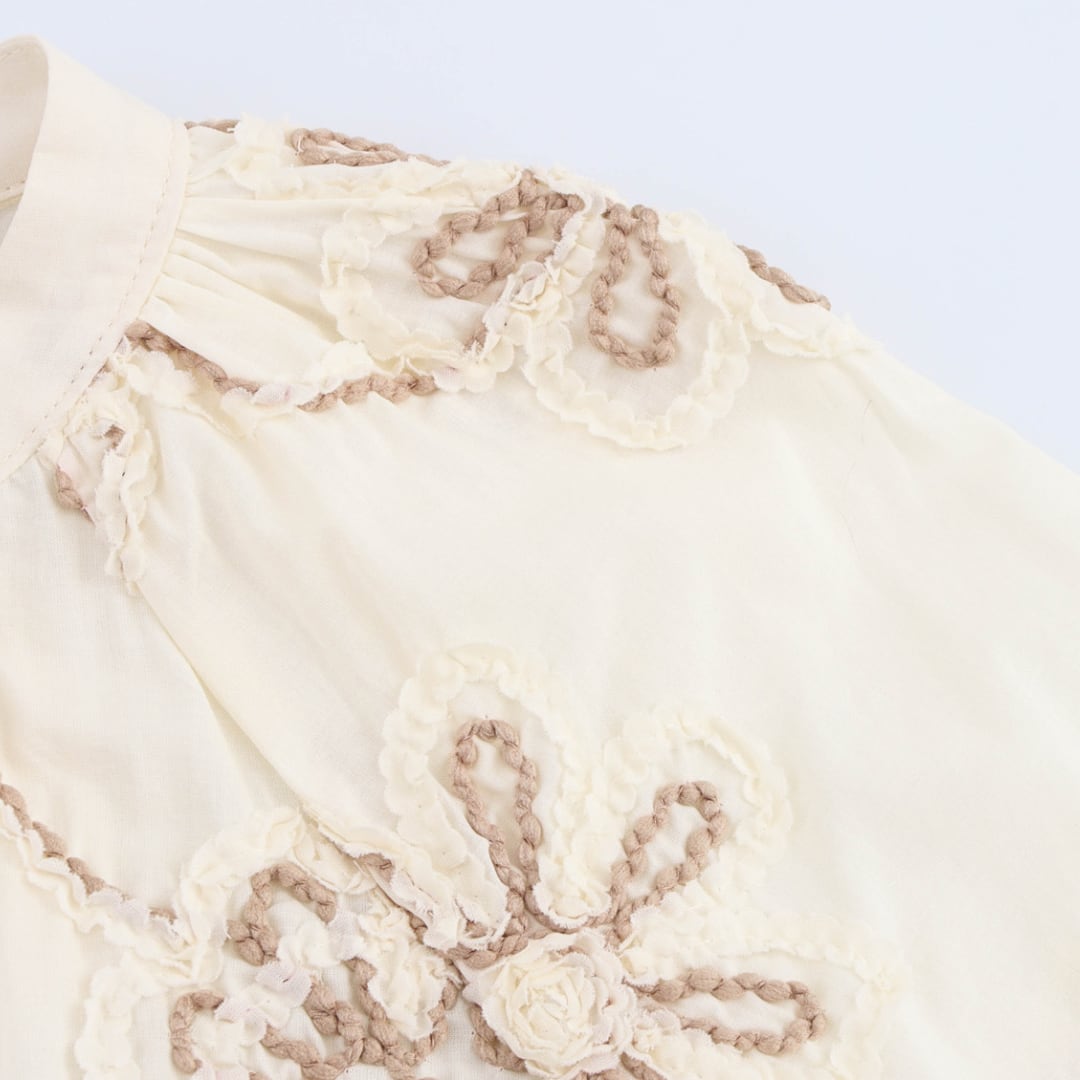 柔らかなアイボリーカラーに繊細なフラワー刺繍をたっぷりあしらった、上品でナチュラルな雰囲気の長袖ブラウスです。