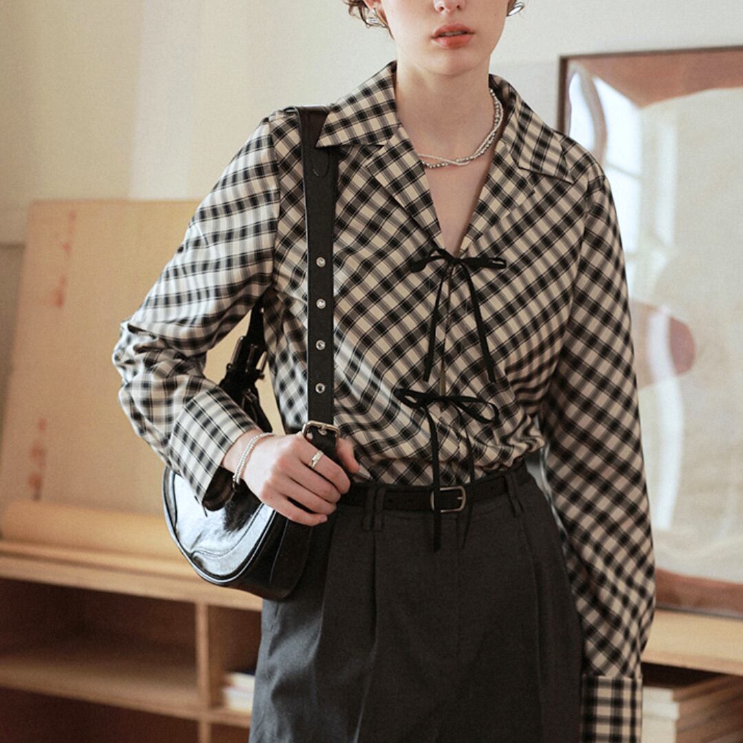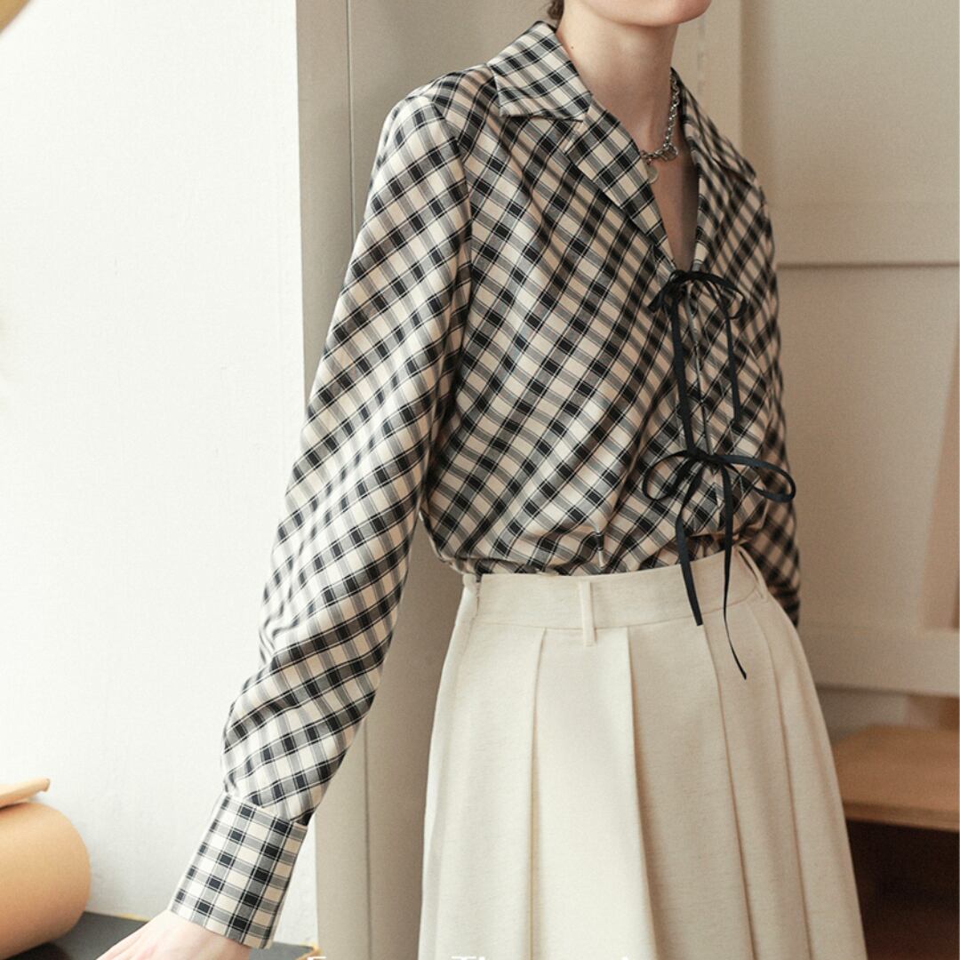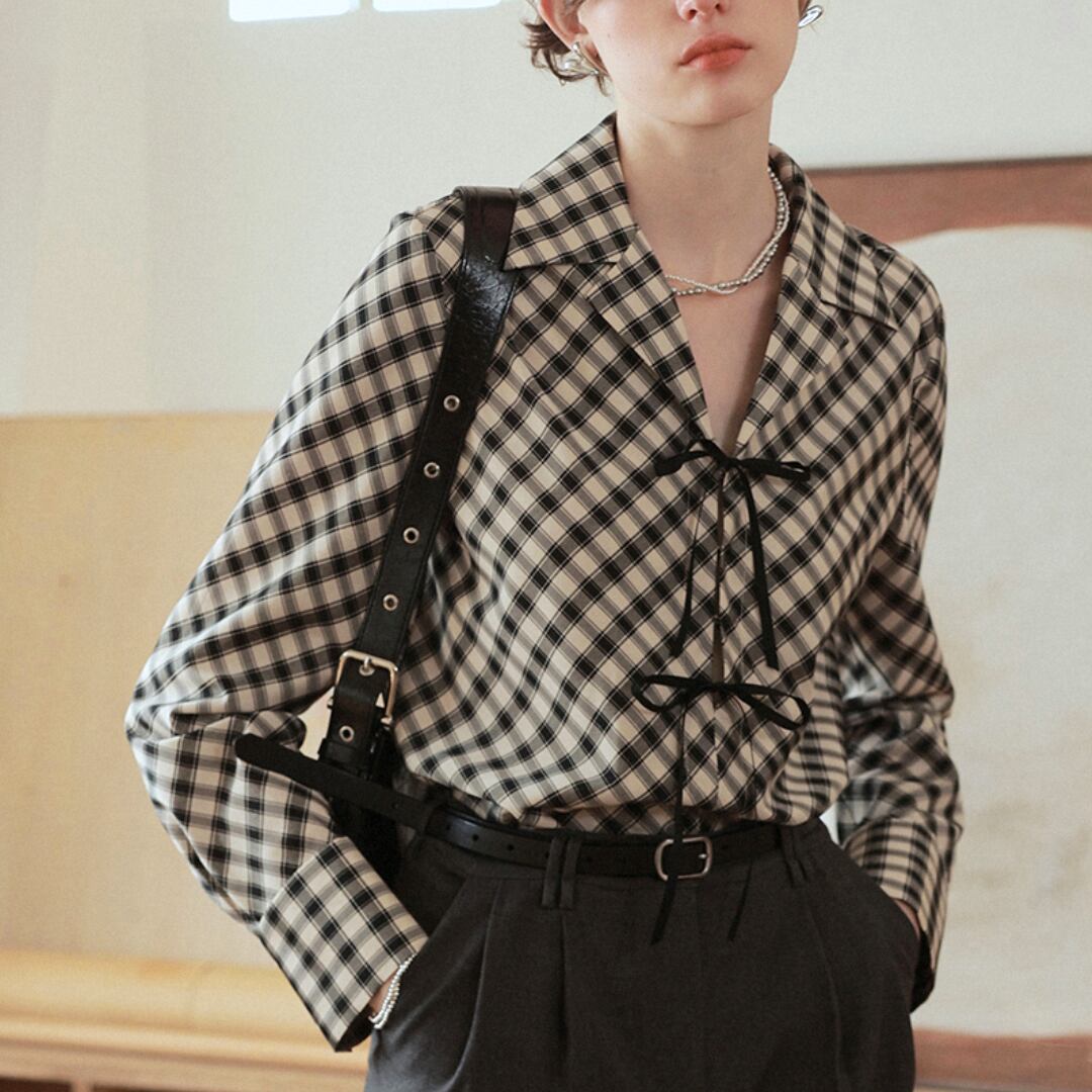 上品さと可愛らしさを兼ね備えたチェック柄のブラウス。正面にあしらわれたリボンが印象的で、女性らしさを引き立てます。落ち着いたチェック柄は、オフィスからカジュアルまで幅広く活躍。