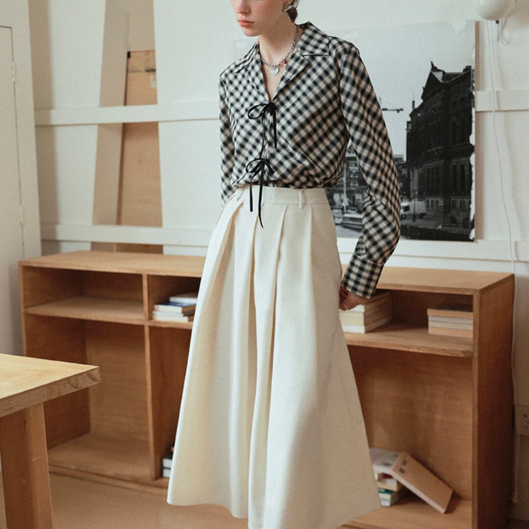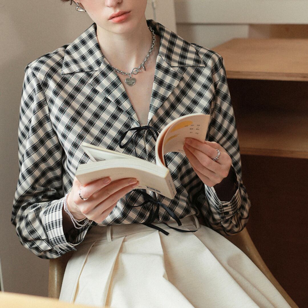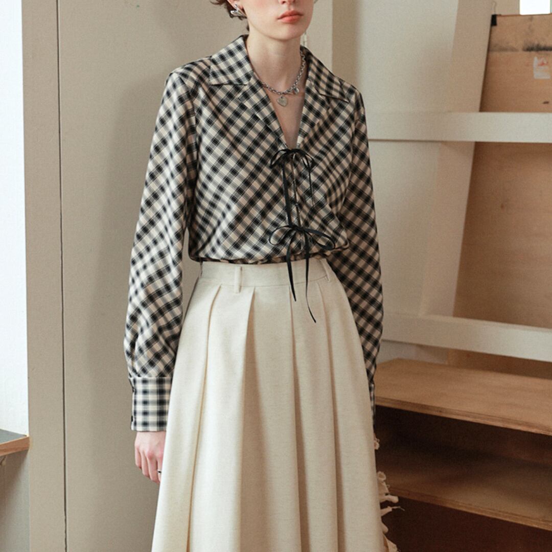 上品さと可愛らしさを兼ね備えたチェック柄のブラウス。正面にあしらわれたリボンが印象的で、女性らしさを引き立てます。落ち着いたチェック柄は、オフィスからカジュアルまで幅広く活躍。
