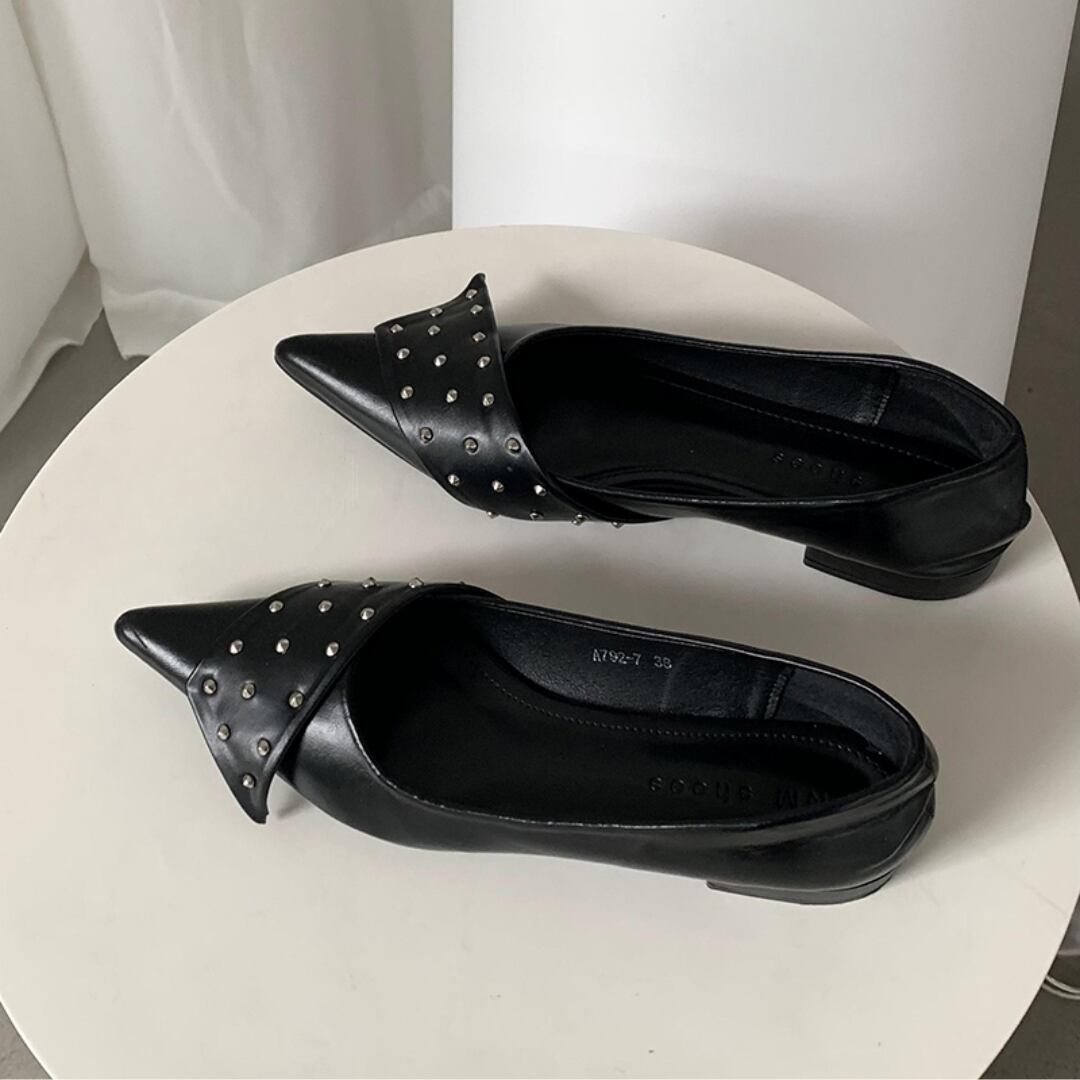 洗練されたスタッズデザインが目を引く、ポインテッドトゥのフラットシューズのスタイルアップ効果と快適さを両立させた一足です。