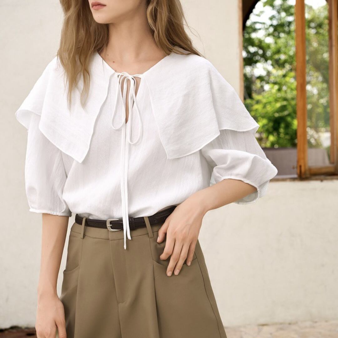 やわらかな印象を与える大きめのフリルカラーが特徴のブラウスです。