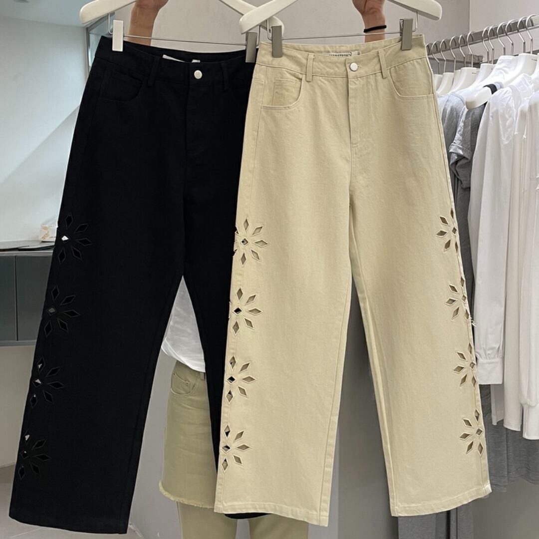 華やかなフラワー刺繍が施された、スタイリッシュなハイウエストカジュアルパンツ。高めのウエストラインは、脚長効果を引き出し、美しいシルエットを提供します。肌触りの良い素材で仕立てられ、動きやすさを兼ね備えたデザインです。