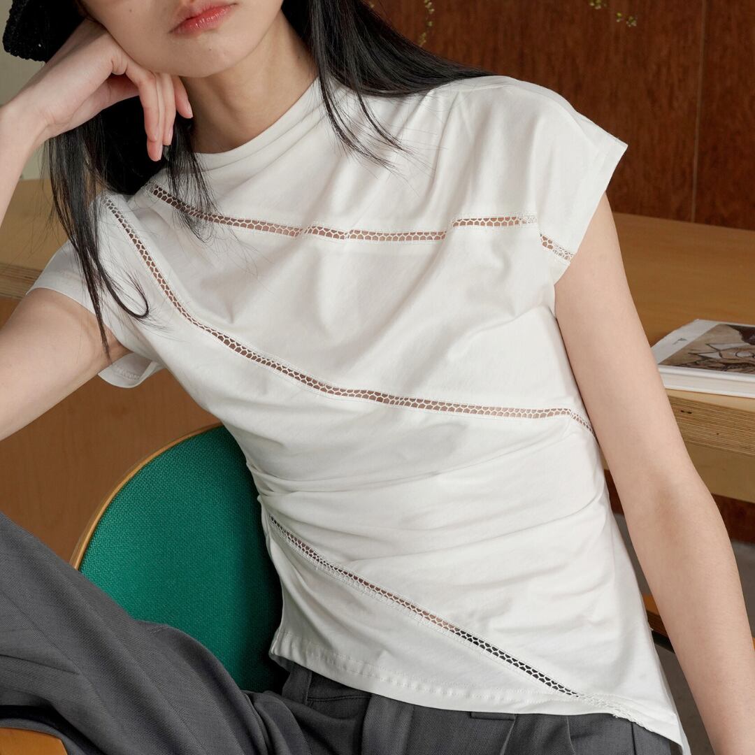斜めのカットとギャザーが絶妙に組み合わさり、エッジの効いたスタイルを実現。