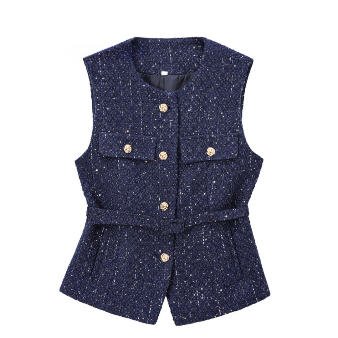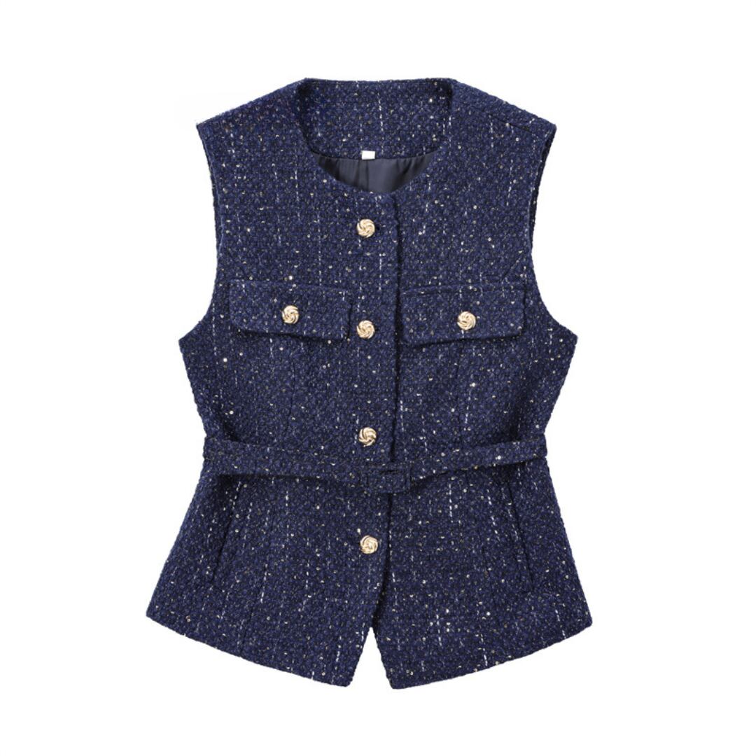 小さなスパンコールが上品に入ったニット素材で、ベルトデザインが女性らしいシルエットを演出。