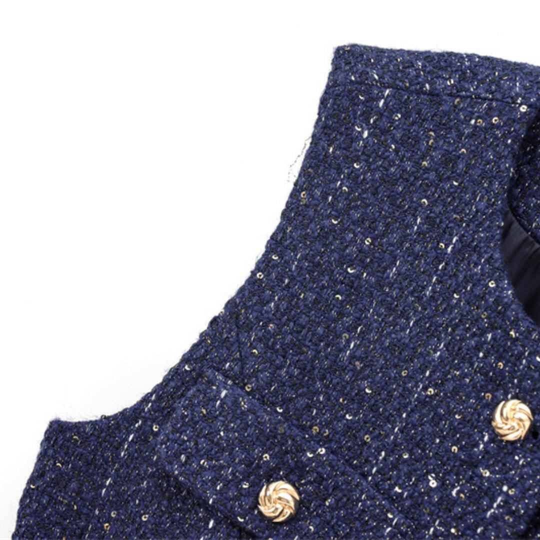 ゴールドボタンがアクセントとなり、シンプルながらも華やかな印象に仕上げています。