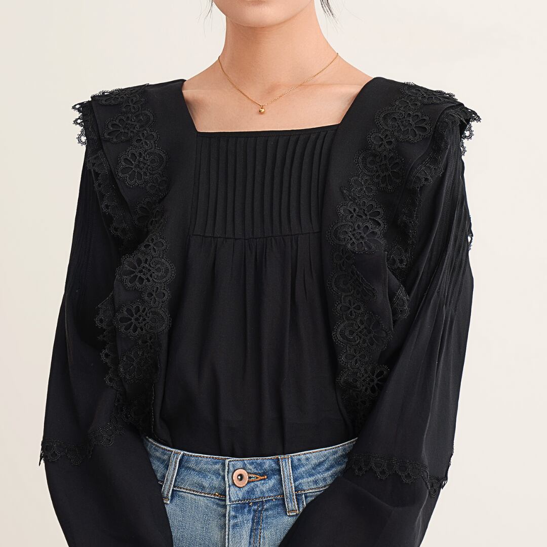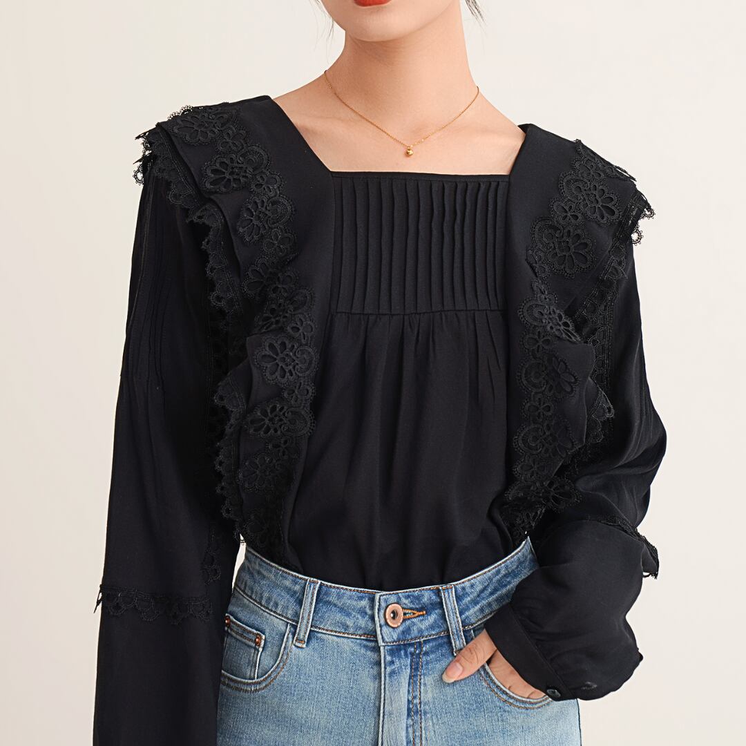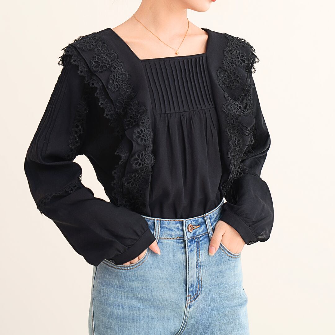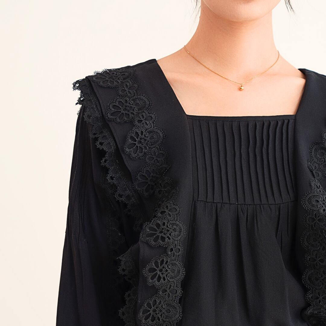 スクエアネックがデコルテを美しく見せ、クラシカルな雰囲気を演出。身頃と袖には繊細なプリーツも施されており、動きのあるエレガントなシルエットを生み出します。