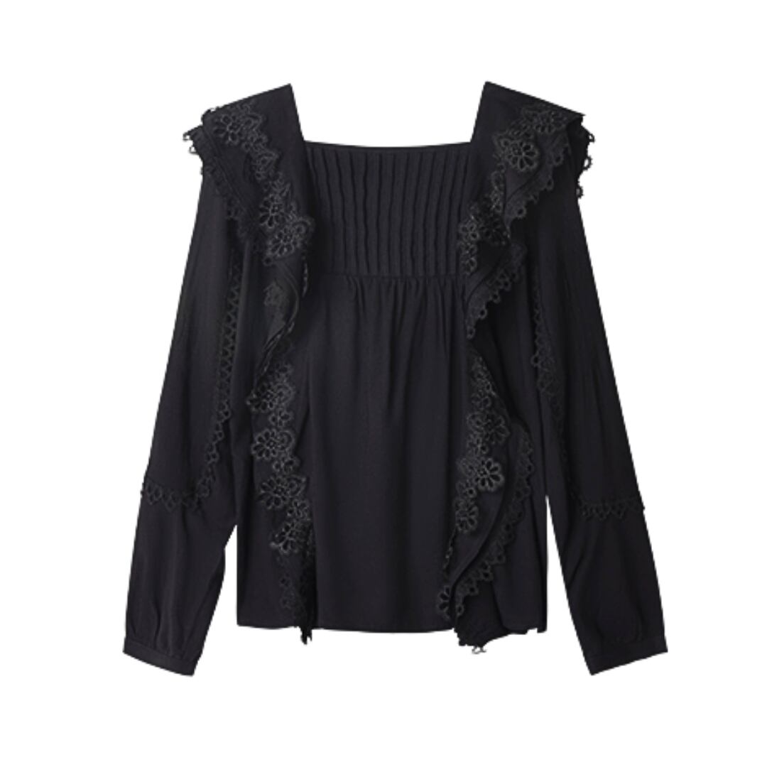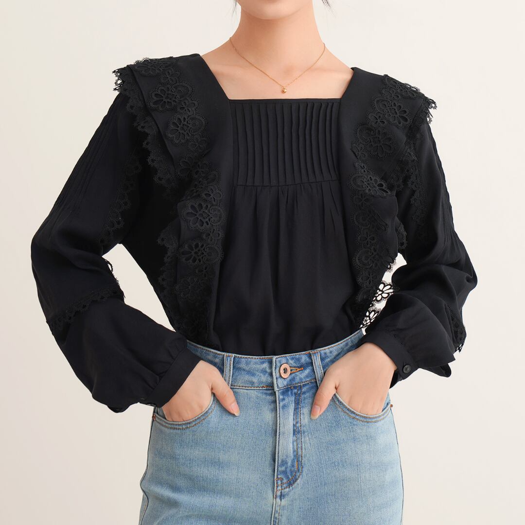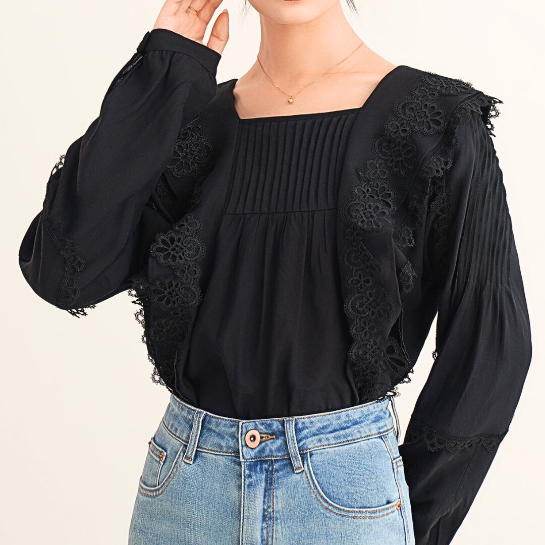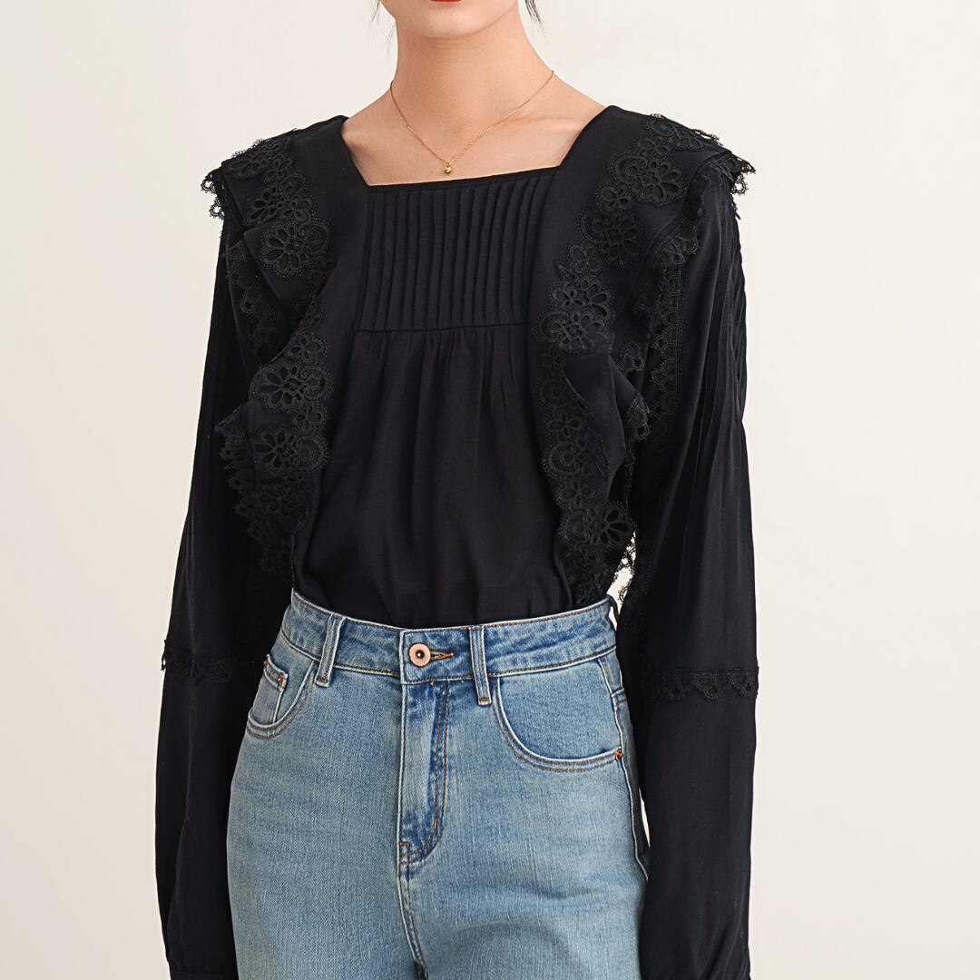 スクエアネックがデコルテを美しく見せ、クラシカルな雰囲気を演出。身頃と袖には繊細なプリーツも施されており、動きのあるエレガントなシルエットを生み出します。