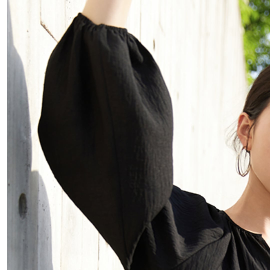 首元のキーネックが程よい抜け感を演出し、女性らしさを引き立てています。また、ふんわりとしたパフスリーブが可憐なアクセントとなり、柔らかさのあるシルエットが大人可愛い印象です。