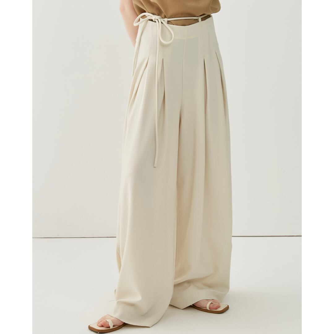 流れるようなシルエットと美しいタックが特徴のワイドレッグパンツ。ウエスト部分に施されたリボンベルトが立体感を生み出しています。