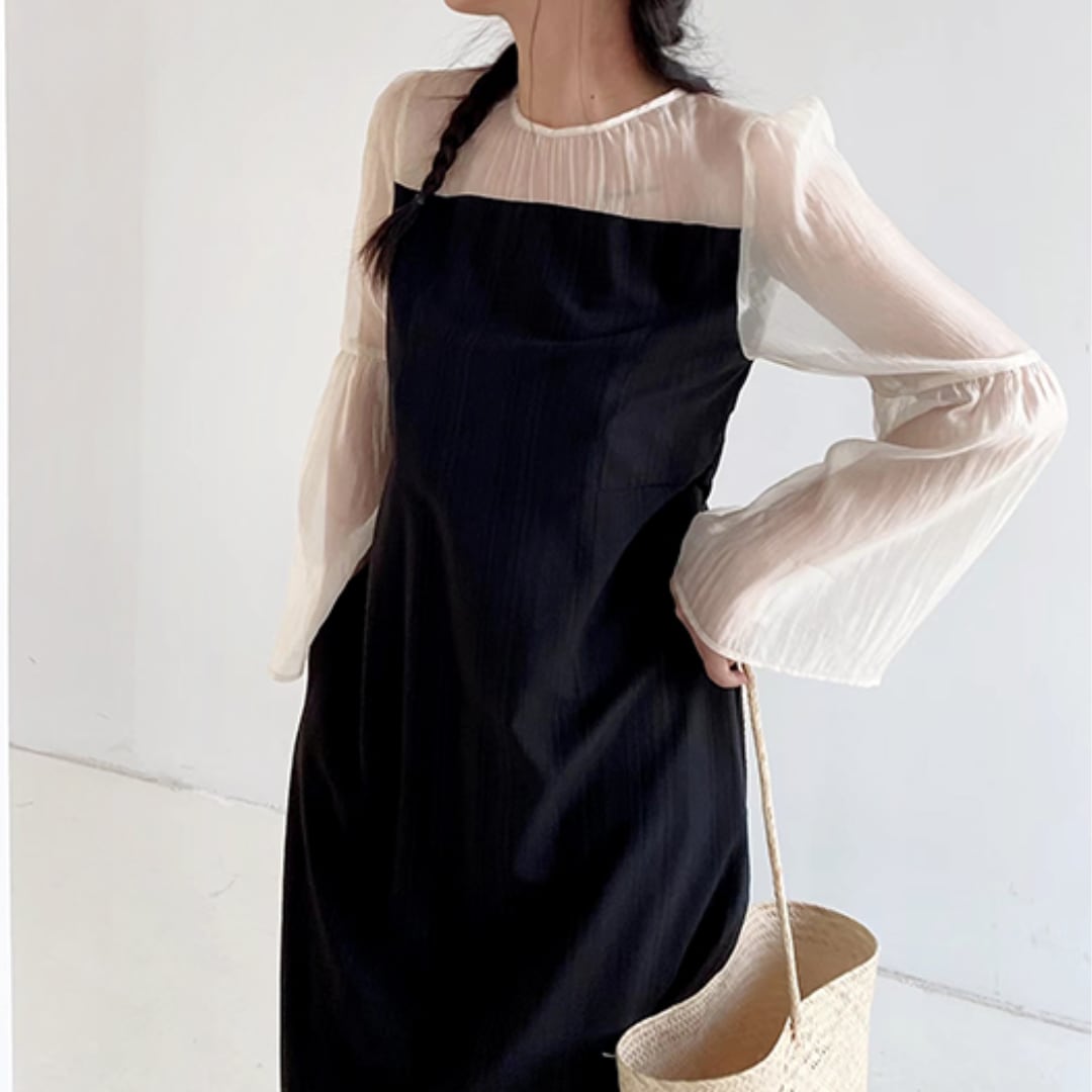 透け感のあるシアー素材が鎖骨周りをほんのりと透かし、上品な色気を演出します。ふんわりと広がるベルスリーブがフェミニンなアクセントに。ストレートシルエットが大人っぽくスマートな印象を与えつつ、裾のスリットが動きやすさと抜け感をプラス。